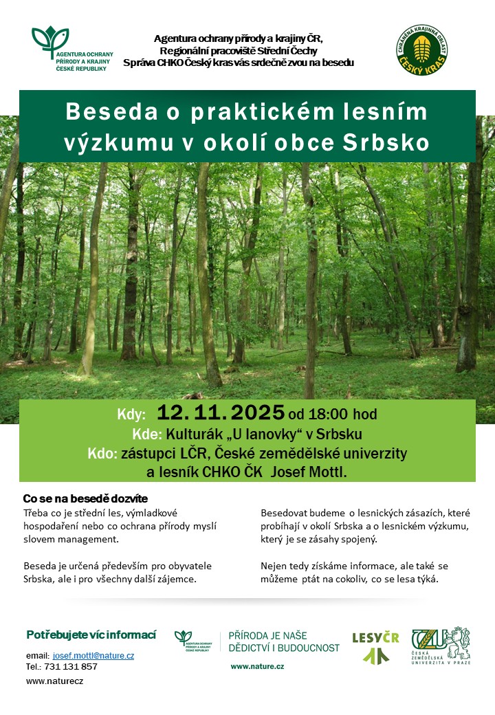 Besedovat budeme o lesnických zásazích, které probíhají v okolí Srbska a o lesnickém výzkumu, který je se zásahy spojený. O tom, co je střední les, výmladkové hospodaření nebo co ochrana přírody myslí slovem management.